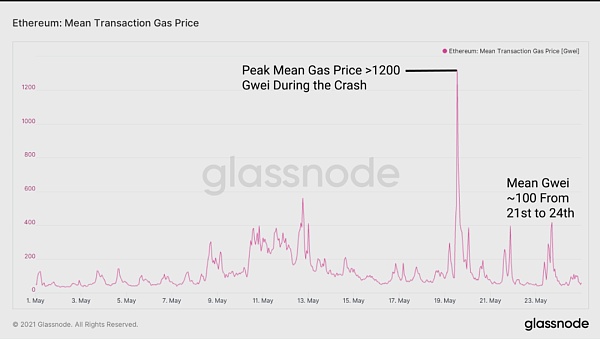 散户投资者在市场最急剧抛售的时间段内基本被挤出。由于大批量交易商、稳定币转移和套利机器人主导了gas消费,gas价格在波动高峰期飙升至每小时1000+的平均Gwei。