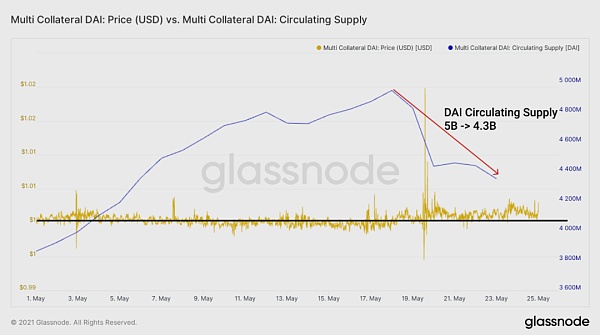 由于DAI在崩盘期间的表现,这对DeFi来说是特别积极的。DAI很好地保持了它的稳定,流通的供应量根据抵押品的要求和协议的稳定性进行了相应的调整。随着抵押品持有人的赎回,抵押品被收回,DAI从供应中移除。这种行为使抵押品保持正常,清算保持在一个正常的水平,DAI保持其价格稳定。