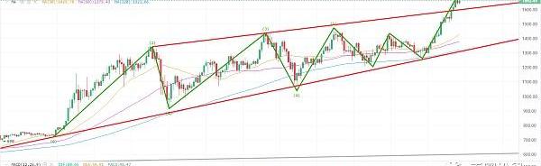 以太坊一直在不断的创下新高,2020年以太坊在主流币中表现最亮眼,2021年初以太坊还在持续不断的新高,继续领涨主流币。DEFI,以太坊智能合约等等利好消息推动下以太坊或将继续延续神话。下方短线支撑关注1600附近,跌破回到上升趋势区间内则下方支撑看至1380-1400虽然看起来比较遥远,但是这已经是下方最近的支撑位。指标上看MACD金叉向上,快慢线呈散发状态。KDJ目前粘合,RSI在70上方,已经超买,谨防回调。短线回踩1600附近可以尝试做多,跌破则观望。