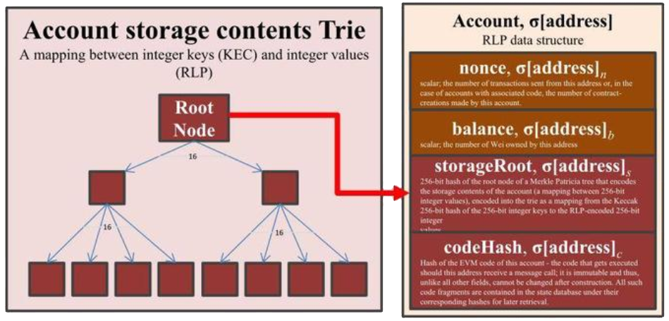 请注意,如果是合约的话,账户状态将包含一个非空的 storageRoot 字段和 codeHash 字段。storageRoot 字段指向另一个根节点。但是,此时所涉及的 MPT 的用途是存储该合约的存储项数据;该 MPT 会将存储空档(storage slot)作为键,将原始数据作为值。