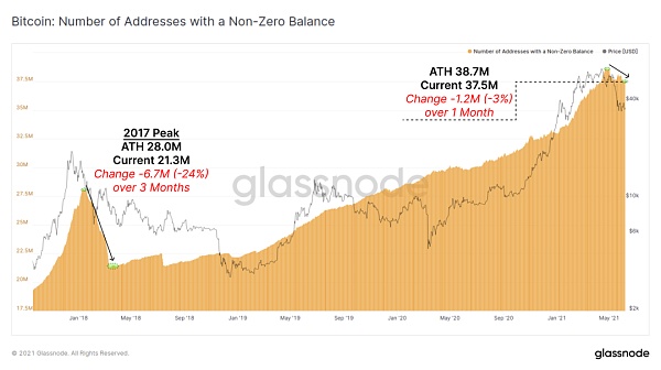 整个 5 月,非零 BTC 余额的地址总数有所下降,总共减少了大约120 万个地址,与下降60%以上的交易需求和其他活动指标不同,非零地址的下降仅比峰值时下降了3%。相比之下,2017 年的峰值时,当时有近四分之一的地址花费了他们的币,这次的下降比例可以说是相对较小的。