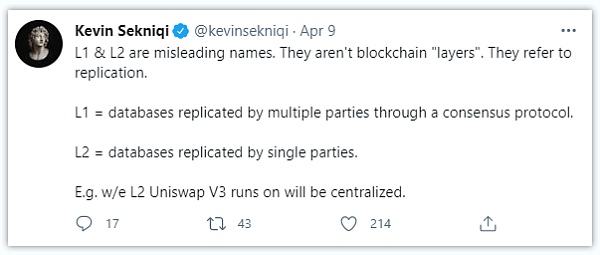 这种中心化让习惯于基于共识的区块链的加密用户感到困惑。事实上,如果故事到此结束,我们可能会 (错误地) 得出这样的结论:Rollups 只是“由单一方复制的数据库”,正如 Avalanche 联合创始人 Kevin Seqniqi 最近在推文中 (误解的) 那样。