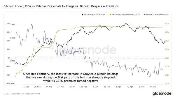 例如,灰度比特币信托(Grayscale Bitcoin Trust)的比特币持有量因机构需求而大幅增长,并于2021年2月停止增长(图10),而其GBTC的溢价实际上变成了严重的负值。