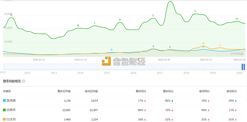 金色财经报道,百度指数数据显示,近30天区块链搜索指数整体日均值为3338,整体同比上升17%,移动同比上升19%;近30天比特币搜索指数整体日均值为22885,整体同比上升80%,移动同比上升98%,近30天以太坊搜索指数整体日均值为3460,整体同比上升18%,移动同比上升25%。整体上,这些搜索数据符合当下市场行情表现,一定程度上体现出大众对区块链以及加密货币关注度变化。