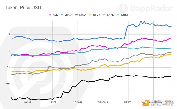 价值增长与区块链领域零售和投资兴趣的增长是紧密联系的。游戏代币与 DeFi 生态系统结合,带来更多价值和趣味性。Axie Infinity (AXS)、MegaCryptoPolis (MEGA)、Gala Games (GALA)、F1 Delta Time (REVV)、The Sandbox (SAND) 和 Aavegotchi (GHST) 的代币价格在第一个季度都展现了巨大的增长。
