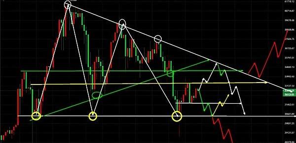 目前BTC结构走势大盘还是比较弱,之前行情关注是对称三角形的破位结构,价格下方的30500的支撑当前看比较强势,现在关注市场结构看行结构要去走出对称三角形走势结构震荡形态去看当前行情结构走势,就按照当前的震荡区间关注市场结构形态.