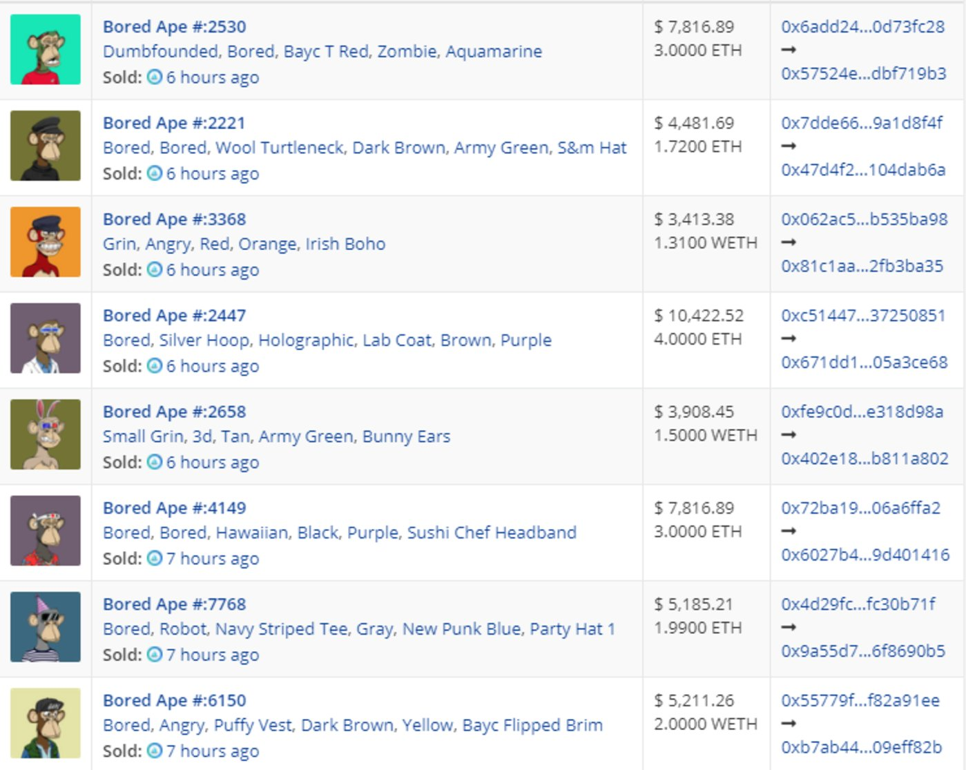 譬如,当下最火的NFT项目当属Bored Ape Yacht Club ,第一批卖的全是由一个个像素组成的猿猴图画,发行价为0.08ETH,总数为1万个不同形态的猿猴,一个月时间每只猿猴的平均价涨至0.72ETH,涨幅高达900%,年化收益率为10800%。