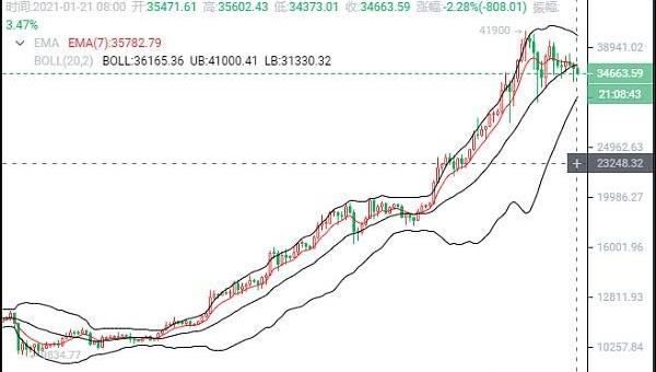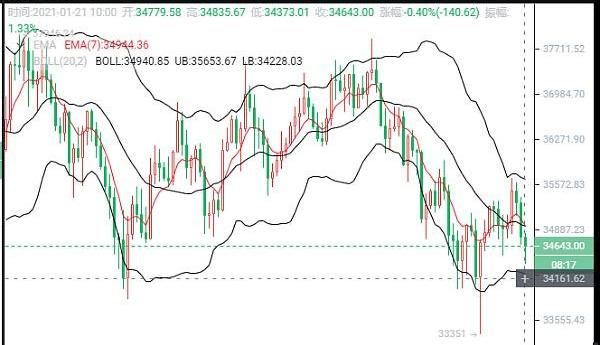 1900/1/1 0:00:00比特币:昨日价格随着老特谢慕!离开白宫,美股齐涨;币圈大量资金流出,导致价格一路下跌;目前我们看到比特币下跌后凌晨小幅回升,日线上价格已经跌破中轨,后期或将开始新一轮跌势;今日最低至33351.