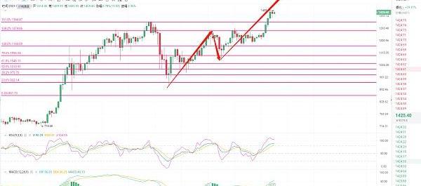 以太坊日线均线前期有明显的金叉上行,四连阳横盘吸筹在今天凌晨方向确定之后延续冲高,高低位的空间接近200点,很完美的布局了一天的多单,均线短周期有明显的多头趋势,大周期依旧是看涨的趋势,附图指标三线粘合上行,底部MACD阳柱已经形成放量,金叉也已经出现,快线DIF上行趋势明显,综合来看日线明显处于多头趋势,那么我们延续布局多单的思路不变,支撑参考前期的区间底部,1340-1350埋伏多单进场代好止损,破位之后后撤在第二区间布控,点位参考1275-1285给到机会继续多单埋伏。