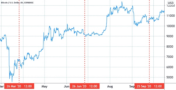 2020年9月26日季度期权到期,当时比特币在前一日上涨了2%,并在接下来的两天内继续上涨了2%。