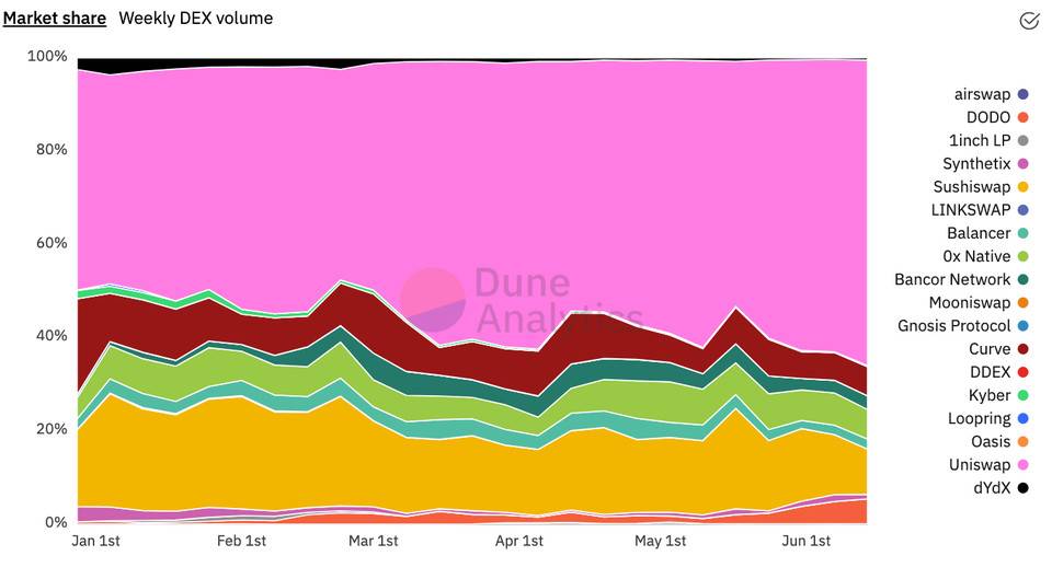 但你猜怎么着?Uniswap 仍然是 DEX 领域的主导力量,没有其他协议能够接近其产生的交易量和费用,这从其 60% 以上的市场占有率以及年初至今三位数的增长率可见一斑。