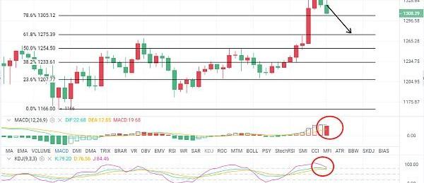 现在我们从日线图来看,目前是一根阴柱,而4小时级别图的话,虽然是红柱,但是可以清楚的看到上方的压力位是非常强劲的。1小时级别图也是压力位在压制之中。幅图MACD即将形成死叉。KDJ三线也呈下拐发散运行状态,且有进一步扩大的趋势。因此,目前我们的思路要以高位空单为主。
