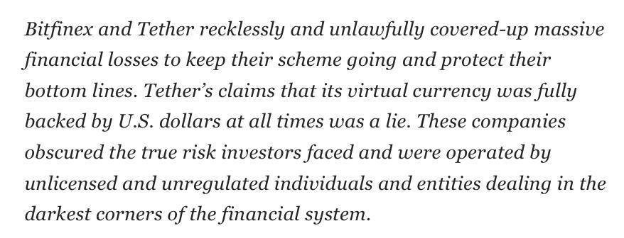 「Bitfinex 和 Tether 不计后果地非法掩盖巨额财务损失,以维持他们的计划,并保护他们的盈亏底线。Tether 声称其虚拟货币一直完全由美元支持,这是一个谎言。这些公司掩盖了投资者面临的真正风险,它们由无证、不受监管的个人和实体经营,在金融体系最黑暗的角落里交易。」