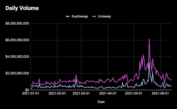 上图:Uniswap (红线) 和 Sushiswap (蓝线) 今年以来的每日交易量变化趋势。图源:Token Terminal