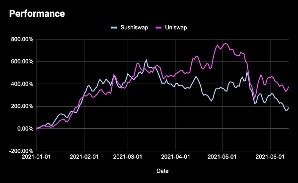话虽如此,这两个 DeFi 协议都经历了不错的表现。今年迄今 SUSHI 的美元价格上涨了 189% 以上,而 UNI 仅在今年就上涨了 378%,见下图。