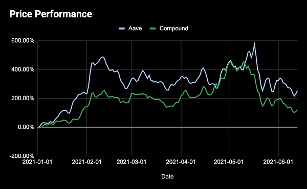 上图:今年迄今 AAVE (蓝线) 和 COMP (绿线) 代币价格的涨幅变化情况。数据来源:Token Terminal