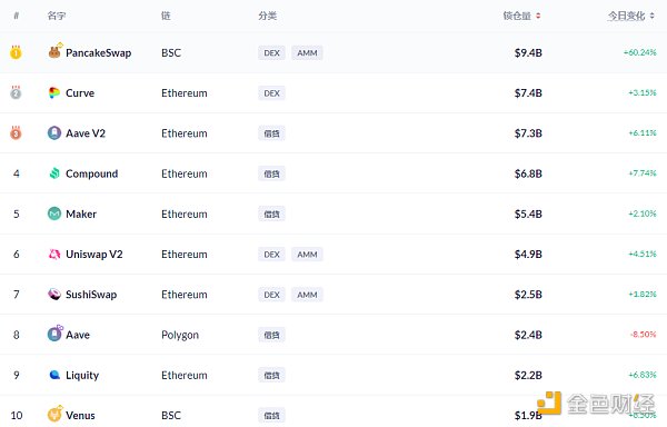 DeFi项目锁定资产前十排名及锁仓量,数据来源:Debank