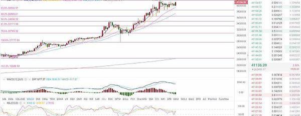 夏天的考验来自于燥热的心能否平静,而冬天的挑战来自于干脆利索的摆脱温暖被窝。当人们依赖于被窝的安逸时,要么被动的认为工作要迟到,要么主观的认为对抗寒冷是一种挑战,后者总会感到有一种心中的热血准备着沸腾的面对今天。而交易涵盖了春夏秋冬,有时需要抵御躁动的心情,有时又需要一颗热血勇于挑战的心。近期行情已经步入牛市阶段,行情也是一路高歌不断刷新高点,以太如期而至,再次突破1300高点,比特币也是在40000上方站稳脚跟,那么可见牛市不言顶,行情还有进一步上升可能,行情虽好但切记风险,操作的同时带好止损,今日从小时图来看,短期内还有再次试探上方高点阻力走势,KDJ三线再次向上粘合扩散,MACD快慢线粘合即将形成金叉走势,短期内依旧有看涨信号,建议短期内短线多单入场。