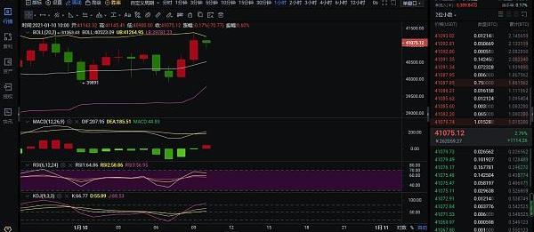 大饼探底回升,重回41000上方,多头非常强势,小时级别来看,昨日午间15:00大饼触底38736一线反弹,持续震荡上升,K线连续7连阳,22:00触压41363一线回调震荡下行,K线三连阴,回吐部分跌幅,在39891触底延续震荡上行走震荡,7时二次触底39900一线反弹,K线连续二连阳冲高,触压41350上轨一线压制回调,从走势来看,多头是比较强势的,目前技术面来看,币价触压上轨一线压制回调,上轨拐头下压形成短期压制,MACD快慢线金叉向上,空头逐步缩量转变多头柱能,KDJ金叉向上放缓,短期行情进入震荡,日内建议先看一波回调。