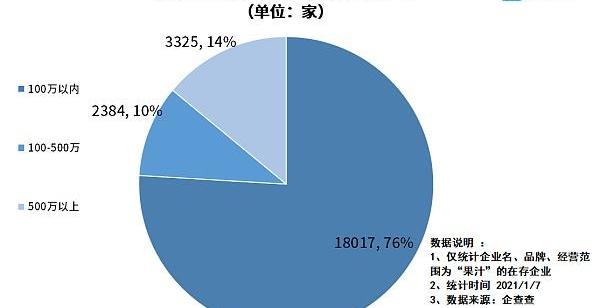 从企业规模来看,企查查数据显示,目前注册资本在100万以内的果汁企业数量最多,有1.8万家,占比总量的76%。其次是注册资本在500万以上的果汁企业,有3325家,占比14%。注册资本在100-500万之间的企业最少,有2384家,占比10%。