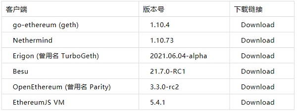 为了兼容 “伦敦” 升级,节点运营者需要升级自己的节点客户端版本。下面的列表列出了在测试网上支持 “伦敦” 升级的各客户端的版本。主网升级区块确定之后,各客户端会专门发布另一个版本。