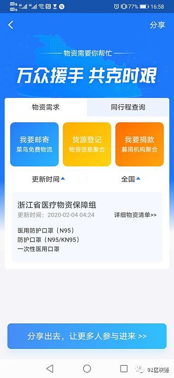 浙江省医疗物资保障组已在支付宝的“防疫物资信息服务平台”发起第一项物资需求清单,该平台利用蚂蚁区块链技术,由浙江省卫健委、经信厅主导,将对物资的需求、供给、运输等环节信息进行审核并上链存证。
