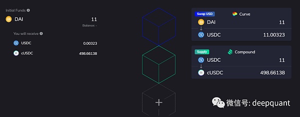 Furucombo将各大DeFi协议可视化,作为一块块乐高积木,在不需要编程的情况下,用户只需拖放,即可设计组合专属于自己的 DeFi 策略。对于想要跨不同协议执行操作的用户,只需要输入/输出相关代币数量,并设置多层操作顺序,Furucombo就会将所有的数据集打包为一个交易发送出去。