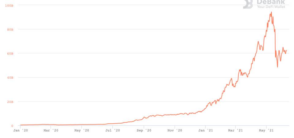 DeFi 成为第一个广泛使用的以太坊网络应用。目前,DeFi 拥有 600 亿美元 的资产管理规模(在 2021 年 5 月上旬曾达到 1200+ 亿美元的峰值),超过 170 亿美元的未偿还贷款,并且平均每天促成 50 亿美元的交易额。这些 DeFi 应用一起产生了 45 亿美元以上的年营收(这是过去 30 天支付给协议的费用,这一指标可以视为营收的风向标),并积累了大量的流动性产生网络效应。