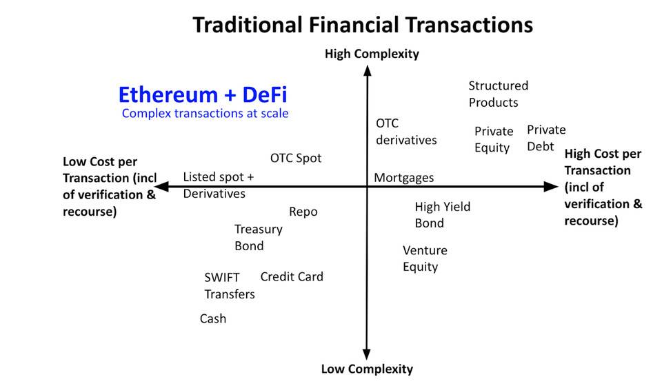 我们认为,以太坊和 DeFi 有可能颠覆传统金融,因此应给予相应估值,原因如下: