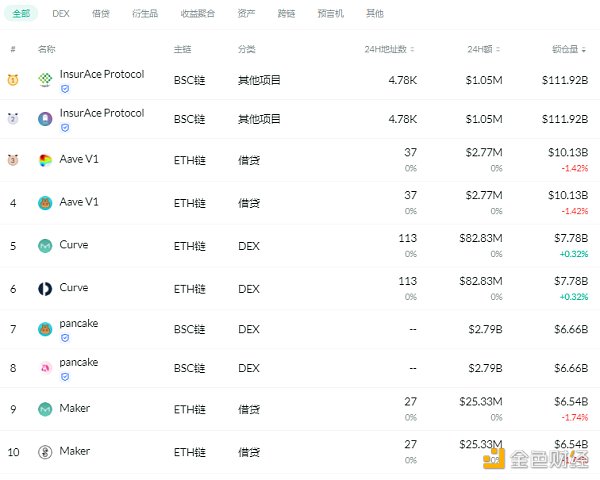 DeFi项目锁定资产前十排名及锁仓量,数据来源:Debank