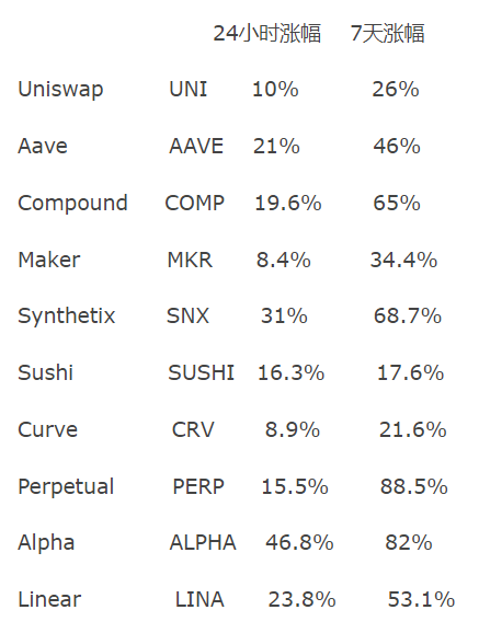 但DeFi真正让让市场感到有了一点热度的是一些天王级项目。上述排行榜还记录了过去7天和24小时内上述项目的代币涨幅。以下是一些特别突出的项目。