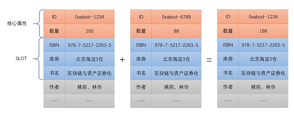 比方我们看到两个 vNFT,其中都包含有这三个属性,而且都是("ISBN 978-7-5217-2263-5", "北京海淀3仓","区块链与资产证券化"),那么不管这两个 vNFT 各自还有什么别的属性,也不管它们其他的属性是否相同,我们都可以认为这两个 vNFT 都同属于这一个 SLOT,也就是属于同一类。由此它们便可以加和。当它们加和时,两个 vNFT 合并为一,新的 vNFT 保持这两个属性的值,将其数量属性的值加和。