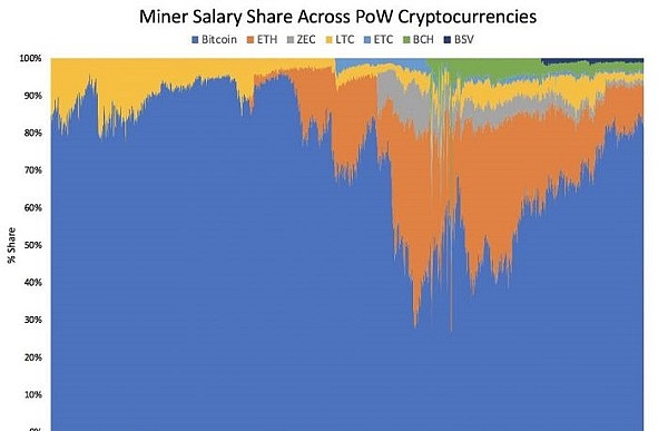从数字上来看,比特币矿工获得的挖矿激励占到了主流工作量证明区块链挖矿激励的近83%。自2017年年中以来,比特币矿工获得的挖矿激励份额已经增加了250%,而加密货币市值排名第二的以太坊的挖矿激励份额却出现了明显下跌。