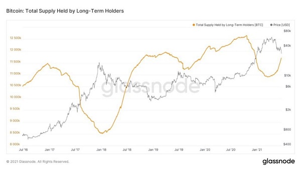 比特币:长期持有者持有的总供应量,资料来源:Glassnode