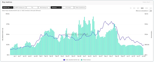 我们可以从 Compound 协议每日的收入看出这一点:在一个多月的时间里,当前 Compound 的日收入较 5 月份市场崩盘前的峰值下降了超过 71%。