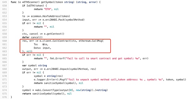 继续验证我们的猜测,我们看到当代币地址在系统中不存在时,会从以太坊主链上去获取合约信息,并以获取到的 symbol 构建出新的代币,此时所有的漏洞成因都已经显现: