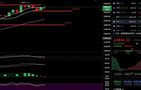 ???四小时技术级别来看,附图指标布林带开口呈上扬姿态,MACD多头能量柱持续放量,各项指标均在中上轨运行,目前整体盘面延续多头强势,且支撑点位逐渐上移,回调力度偏弱;短期1小时级别来看,昨日币价试探25000上方位置受阻走出回撤,且行情形成洗盘画门形态,行情由弱转暖走出阶梯式上涨;日内下方支撑重点关注24500附近位置,若维持上方发展,币价有望再次刷新历史价格,反之试探再次突破下方支撑且稳,预计将有千点回调;操作上我们顺势而为即可,带好防守位。?