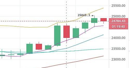 比特币日内如预期上行突破至25000一线,高点触及25045位置后承压回调,目前上行攻势有所减弱,行情处于回调节奏当中,价格下行至24700区域。短期有继续下行的趋势,但是大方向依旧是一个上行姿态,况且目前价格再度刷新历史高位,后续行情一旦触及支撑走出反弹,多头情绪得以回暖,走势有望企稳25000一线再度向上试探。目前攻势有所减弱,所有操作上建议回调多单为主,下方支撑线关注24500一线,其次看24200位置附近,上方压制关注25000一线。