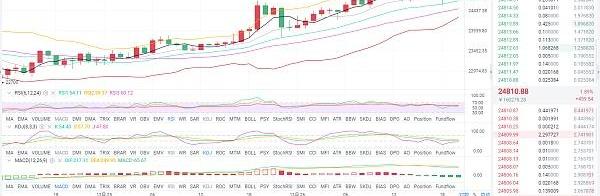 比特币日内早间突破历史新高触及25000一线承压回调,晚间行情回踩上行,价格再度触及25000一线出现回调,走势上行频频受阻,25000区域存在较强压制,后续谨防行情反转破位走出大幅回调,短周期小时图上看,布林带呈收口姿态,目前行情承压回调,价格出现400多点跌幅,局势短期有转弱趋势,后续若是价格跌破24500区域关键支撑,行情有进一步下行试探24200一线起涨点的可能,再跌破也就意味着日内上行试探失败,价格大概率会回到24000下方区域运行。