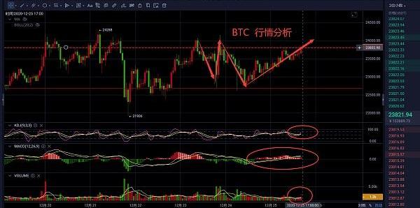 小时图分析,大饼今天白盘是震荡向上。午间4点K线最高来到23874附近遇阻后小幅回落,目前K线在23700附近运行。技术上布林带开口向上,K线沿着上轨通道向上运行。幅图MACD快慢线在0轴线上方,多头量能柱加长。KDJ三线向上开口,VOLUME成交量慢慢加大。综合各个技术指标看,短期回踩看多。