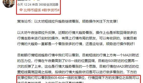 目前的短线行情依旧是一个看涨的趋势,目前的行情的行情还是在顺势进行操作就好,对于后面的行情走势而言,下方的支撑位我们可以看到MA20附近的605-606一线的位置,空仓的朋友回调下方的支撑位可以继续进行多单的进场,顺势突破以后在继续看,上方的压力位还是先看到目前的压力位615附近的位置,等行情突破就好!