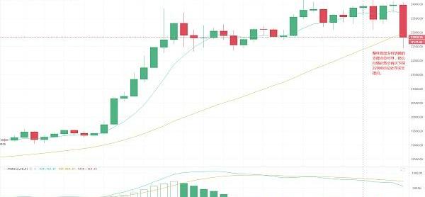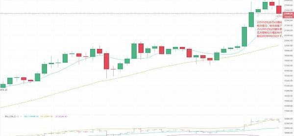 从日线上分析,K线下方出现的是MA7处成为一个短期的支撑点,MACD显示是空头开始放量的状态,快慢线也即将形成一个拐头向下的趋势,RSI与KDJ已经同步形成死叉状态,均线都已开始拐头向下,那么也就是说行情在没有触及支撑点之前,走势可以判断出一个空头的趋势,布林带现呈现一个严重开口的迹象,价位步步紧逼22000点位支撑,该支撑点破位的话,价位有可能再次回到20000关口之下。