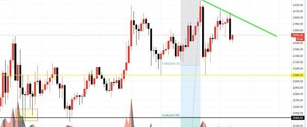 周末比特币积蓄量能,冲高两次,均在24000上方遭遇抛压回落,而回落反弹也均于23100附近收针。当前币价从小时级别看,高位回调点有下移趋势,成交量波动较缓,在此形式下,多头会较为萎靡,积蓄不足。短级别日内关注点应在斐波那契0.786附近,而回踩试探此位置,则大概率形成收缩三角形态。