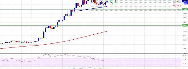 目前正在形成关键支撑基础,昨天,比特币价格在2万美元阻力位之上出现大幅上扬。突破了22000美元的阻力位。上涨的步伐超过了23000美元的水平,也远高于100小时的简单移动平均线。在开始下行调整之前,升至23850美元的历史新高。跌破23000美元和22800美元的水平。然而多头还是得以保护价格不跌破22000美元。
