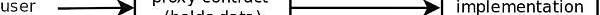 Aave使用了delegatecall代理模式,这一点我们在过去的文章中已经详细讨论过了。简单来看,每个组件被分成了两个合约:包含实现的逻辑合约,包含数据并使用delegatecall与逻辑合约进行交互的代理。在逻辑合约上执行代码时,用户与代理合约进行交互。这是delegatecall代理模式的简化表示: