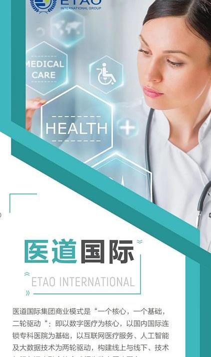 医道国际集团(EtaoInternationalGroup)于2017年在美国特拉华州成立,2020年11月经国家局核准成立“医道国际医疗科技有限公司”(简称医道中国)。医道国际直接对标全美最大远程医疗集团Teladoc,努力打造成为全球领先的数字化医疗平台,将互联网、人工智能、大数据等数字技术与民营医疗行业深度结合,并购生殖、肿瘤、骨伤等特色专科民营医疗机构,并汇聚数千名副主任以上级别国内外医生专家,共同打造全球最领先的数字医疗集团。