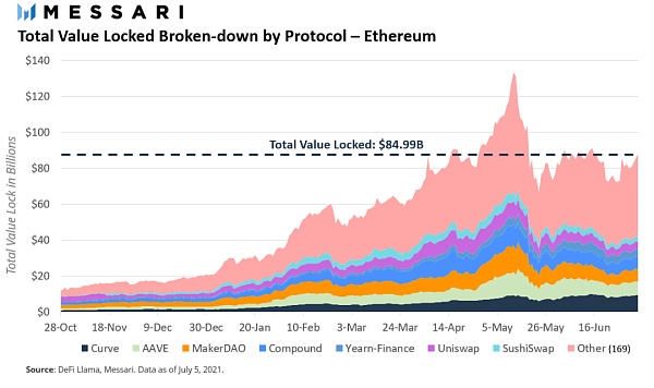 上图:2020年10月以来,以太坊上的各大 DeFi 协议的 TVL 美元价值变化情况 (单位: 10亿美元)。数据截至2021年7月5日。