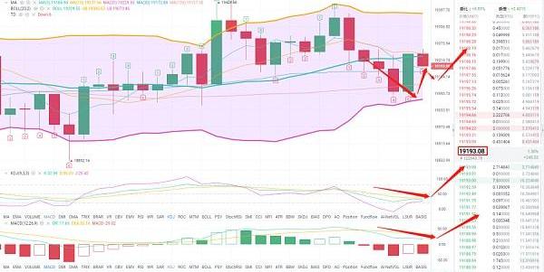 我们结合各周期技术指标来看,目前的行情多空趋势并不是很明显,各指标走势并不一致,但考虑到行情大趋势我们依然还是看涨,那么我们操作的话还是以多单为主,下方关注一下四小时中轨19100附近的支撑力度,上方注意小时级别上轨19400的压制情况。操作的话我们等行情回调至19100-18900附近多单进场,目标点位19300-19500。不管行情如何变化,在大趋势看涨的情况下,我们做单也可以坚定做多,回调甚至瀑布插针更是给到我们一个很好的长线进场机会。