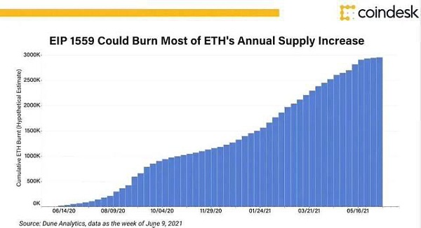 而此次升级将消耗部分交易费用,这将对以太坊的供应产生影响。根据 Coindesk 的报告,可以看到,如果实施EIP-1559,交易费用可能会消耗掉以太坊目前约4%的年度供应增量。