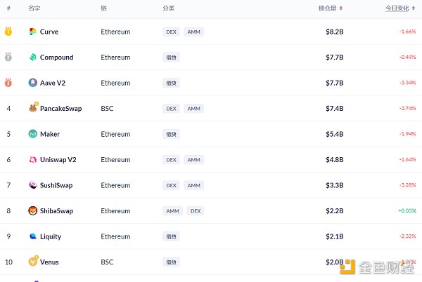 DeFi项目锁定资产前十排名及锁仓量,数据来源:Debank
